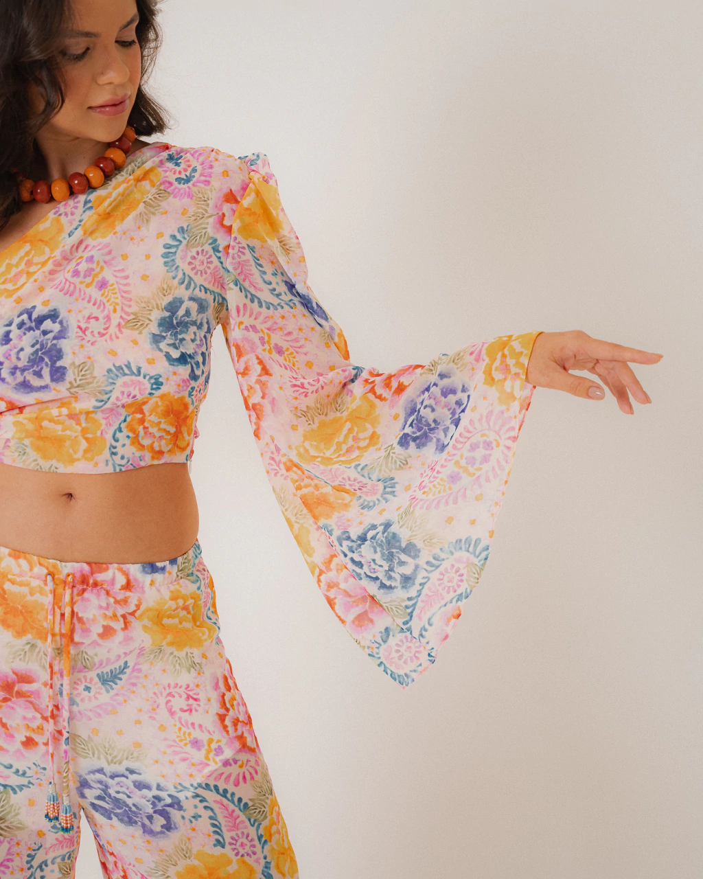Blusa na nossa estampa exclusiva flora, modelo de um ombro só, manga longa e ampla, detalhe em lastex na parte trazeira.