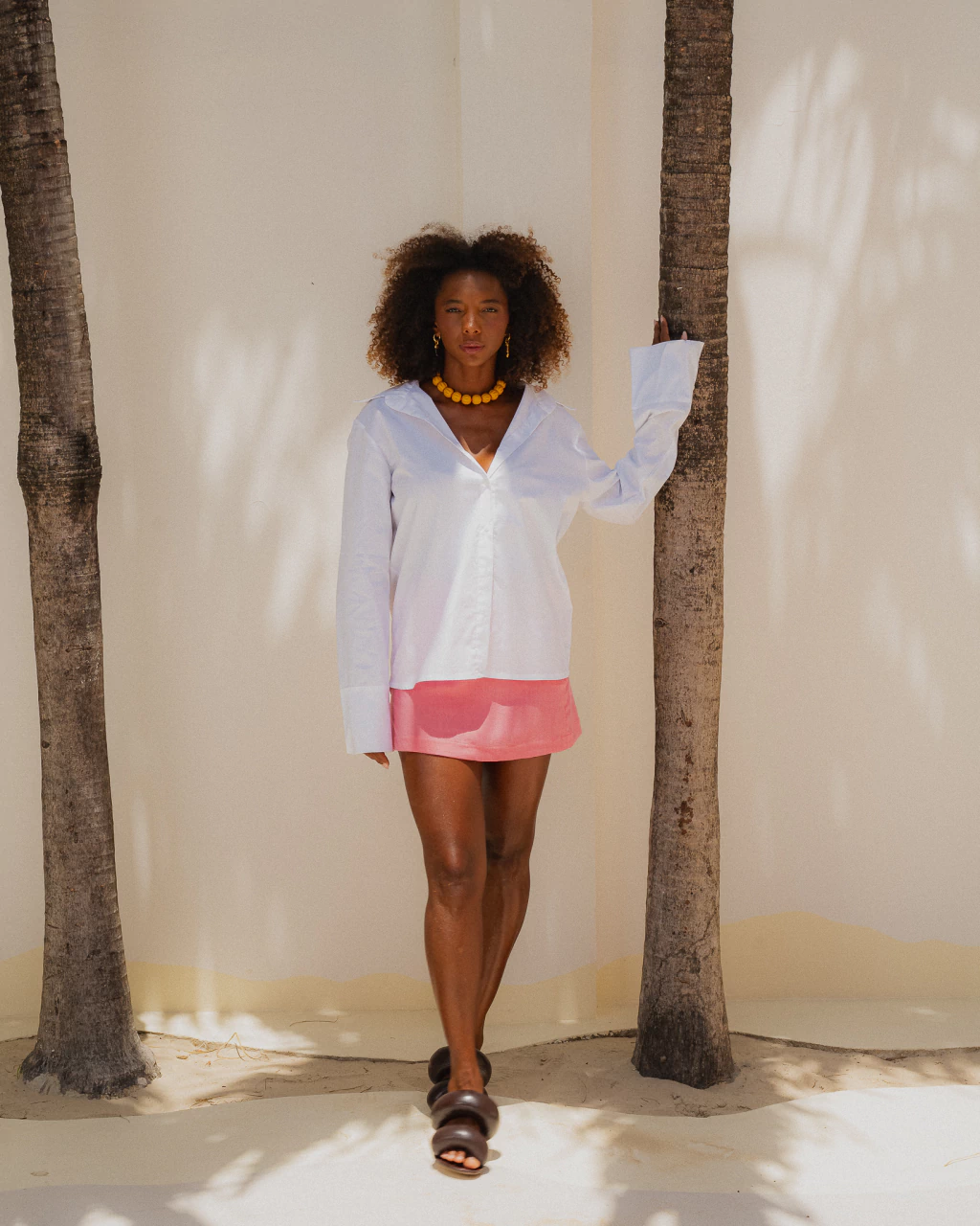 Camisa na cor Branca, mangas, gola e botões frontais.