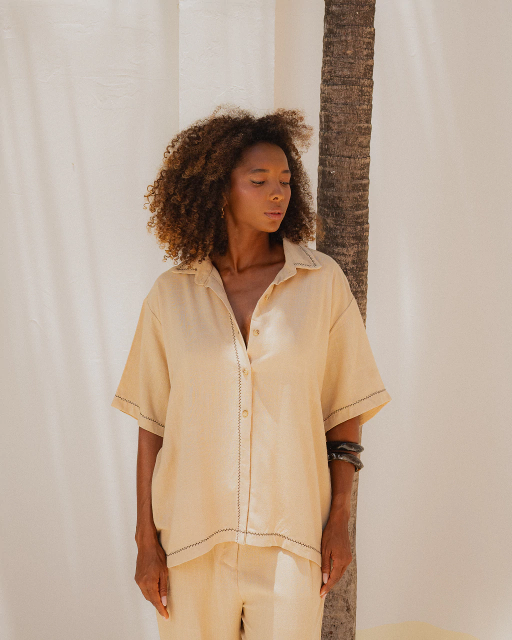 Camisa em linho na cor Areia, manga 3/4, gola bordada e botões frontais.