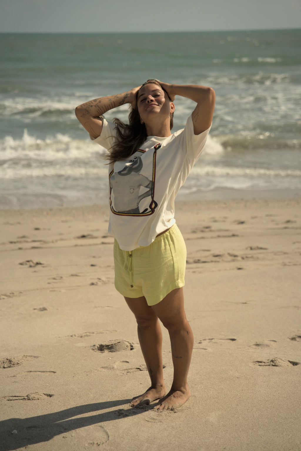 Short em linho na cor Verde, cós regulável com cadarço e bolso na parte de trás.