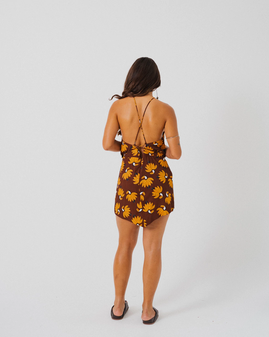 Vestido curto na nossa estampa exclusiva Tucanera, modelo estilo lenço decote mais alto em V com amarração atrás ajustável e saia assimetríca.